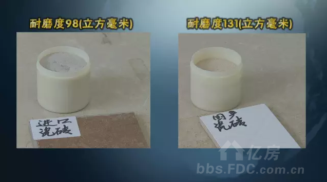 而送檢的進(jìn)口瓷磚的耐磨度平均值是98立方毫米,送檢國產(chǎn)瓷磚是131立方毫米。送檢的國產(chǎn)瓷磚耐磨度低于送檢進(jìn)口瓷磚。