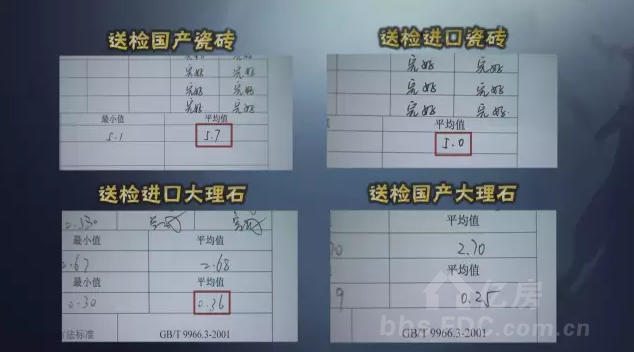 檢測(cè)結(jié)果顯示,送檢國產(chǎn)瓷磚的平均吸水率是5.7%,送檢進(jìn)口瓷磚是5%,送檢進(jìn)口大理石的平均吸水率是0.36%,送檢國產(chǎn)大理石是0.25%。也就是說,在防水性能上,送檢的進(jìn)口瓷磚優(yōu)于國產(chǎn)瓷磚,而送檢的國產(chǎn)大理石的防水性要強(qiáng)于進(jìn)口大理石。